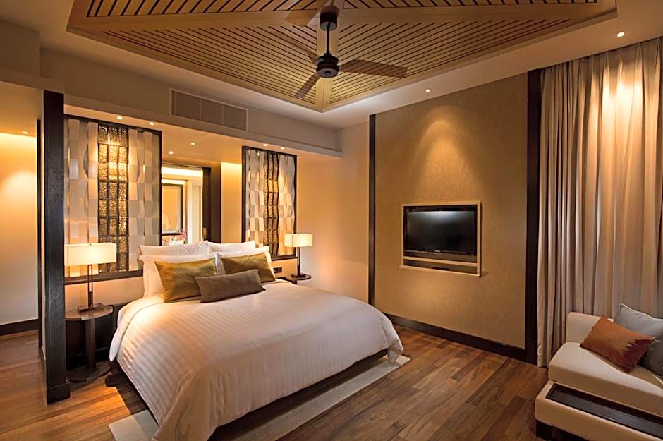 Double-story villa has a 12-yard infinity pool and private lawn with pavilion. Features a living room, kitchenette and marble bathrooms.